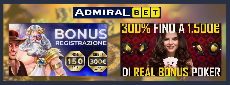 AdmiralBet accoglie i nuovi utenti con generosi bonus di benvenuto su entrambe le sue piattaforme: scommesse sportive e casinò online. Il bonus senza deposito nel casinò offre agli utenti la possibilità di ottenere fino a 100€ e 100 giri gratuiti su slot selezionate, mentre per i scommettitori sportivi è disponibile un bonus del 100% fino a 500€ sul primo deposito. Un ulteriore bonus del 200% fino a 1.000€ è invece dedicato agli appassionati delle slot e del casinò.